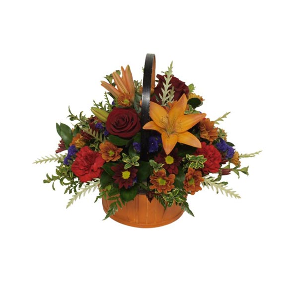 Dites bonjour à l'automne avec ce bel arrangement riche en couleurs chaudes. Composé de lys, de roses, de marguerites, d'oeillet et de statice ce panier mettra du soleil dans la journée à quiconque le reçoit. Un présent qui s'offre pour toute les occasions peu importe le temps de l'année.