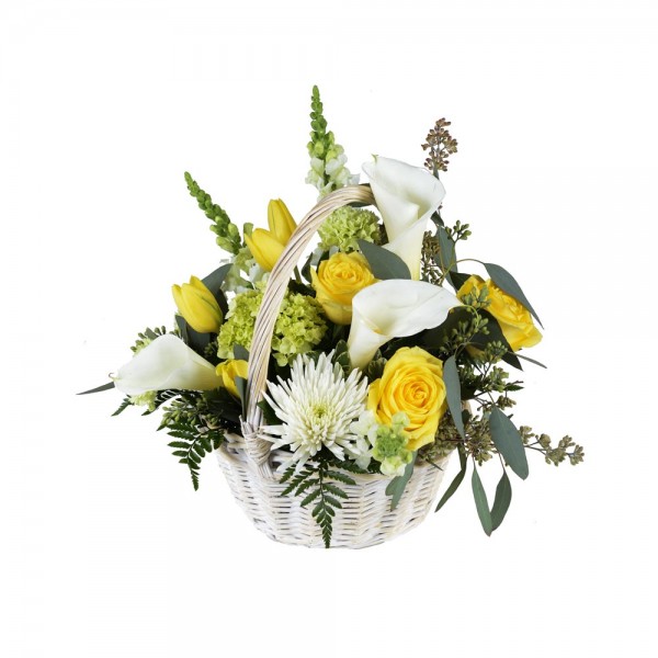 Un très joli panier d'osier composé de délicate rose jaune, de callas et de chrysanthème blanc. Du soleil à profusion.