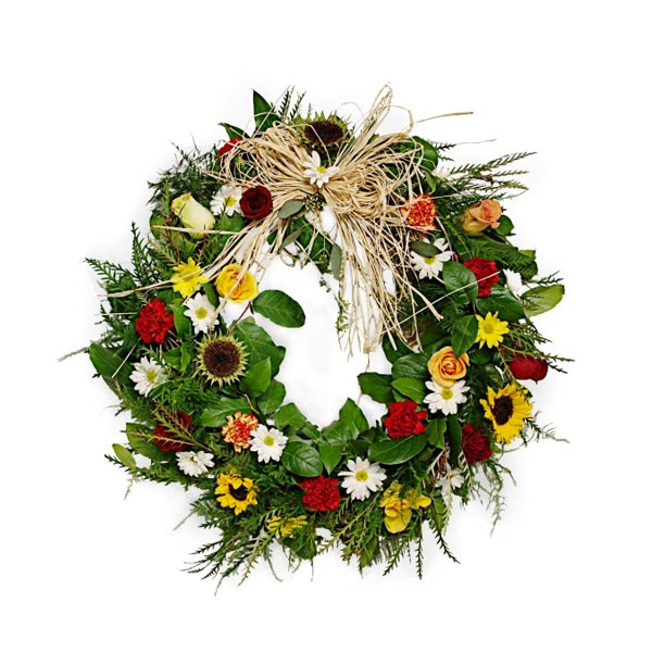 Avec sa composition de tournesol, de roses jaunes, d'oeillets rouges, ses marguerites blanches avec une délicate touche de raffia naturel. Les gens seront touché de cette délicate attention.