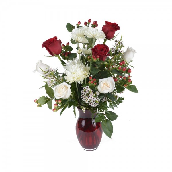 Chaleureux arrangement de Noel, composé de roses, de fudji, d'hypericum et de wax
