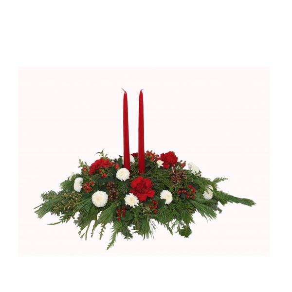 Pour égayer votre table pour Noel, ce centre de table composé d'oeillets rouges et de magnifiques chandelles dans les mêmes teintes fera un succès immense pour vos festivités.