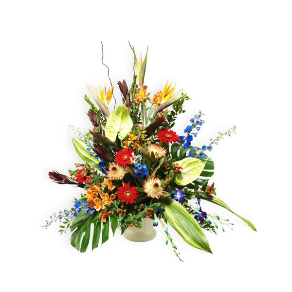 Ce majestueux arrangement composé de fleurs exotiques dont les anthuriums, oiseaux du paradis, protéa ainsi que plusieurs autres variétés de fleurs qui saura attirer tous les regards.