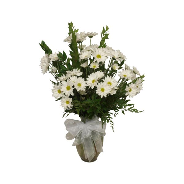 Voici un bel arrangement de marguerites blanches. La fleur de marguerite est simple, blanche et très appréciée. On l'utilise aussi en amour: je t'aime un peu, beaucoup, passionnément, à la folie.